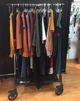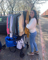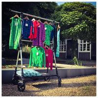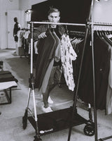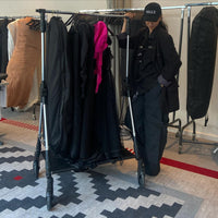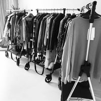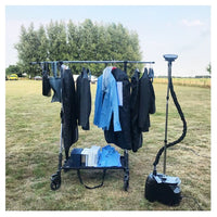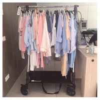 Mobiel kledingrek gemaakt van duurzame materialen. Stevige en robuuste wielen helpen om gemakkelijk over hobbelige stoepen, kinderkopjes of drempels te lopen. Het is uitschuifbaar, draagbaar en gemakkelijk in en uit te klappen.